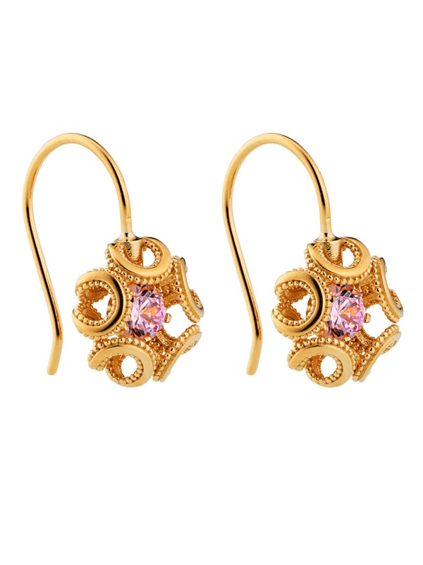 Alma korvakorut yhdistävät viktoriaanisen koristeellisuuden ja modernin muotoilun pitsimäisillä yksityiskohdilla. Korvakorun keskelle asetettu vaaleanpunainen kivi korostaa korun kerroksellisuutta. Alma on moderni perintökoru – näyttävä mutta ajaton valinta sekä juhlaan että arkeen. Saatavilla myös hopeisena. Korun koko on 10x19mm
