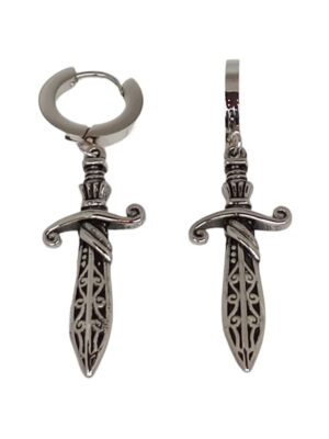Ruostumattomasta teräksestä valmistetut tikari korvakorut. Renkaissa on saranalukitus.