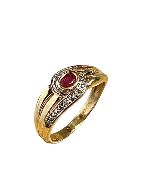 Kaunis 14k kaksivärinen kultainen korusormus ovaalin muotoisella rubiinilla ja neljällä timantilla. Koko 17,0 mm.