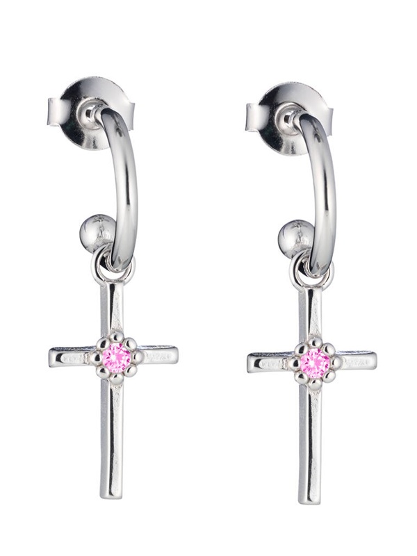 Avainsanat tuotteelle hopeiset ristikorvakorut, Lumoava Daisy risti korvarenkaat pinkillä kivellä hopeaa