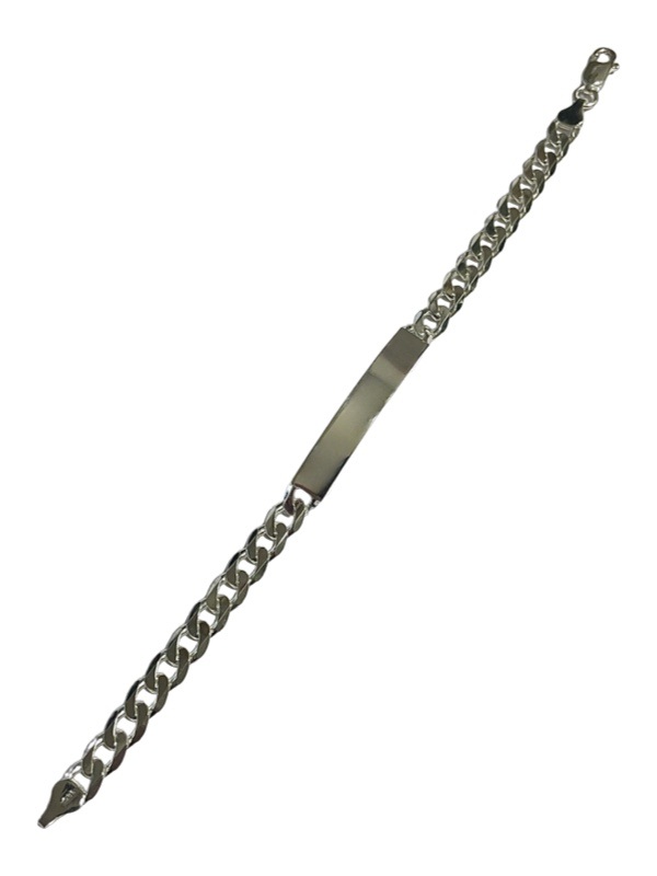 Hopeasta valmistettu laatta ranneketju. Ketjun pituus 20 tai 22cm ja leveys 7mm. Laattaan on mahdollista kaivertaa esim. etupuolelle etunimi ja taakse päivämäärä.
