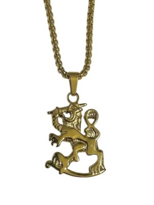 Teräksestä valmistettu Leijonariipus ketjulla. Kullanvärinen pvd-pinnoite. Riipuksen koko on noin 21 x 30mm ja ketjun pituus 50cm.
