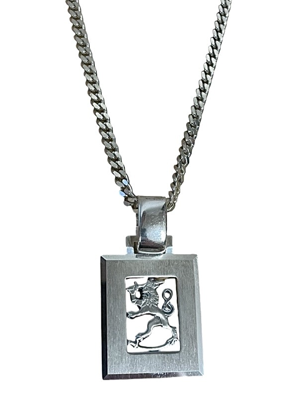 925 hopeasta valmistetut leijonariipus ja panssariketju. Riipuksen pinta on himmeä ja reunat ovat kiiltävät ja viistetyt. Riipuksen on valmistanut kotimainen Saurum. Voit valita riipuksen ja ketjun, pelkän riipuksen tai pelkän ketjun.