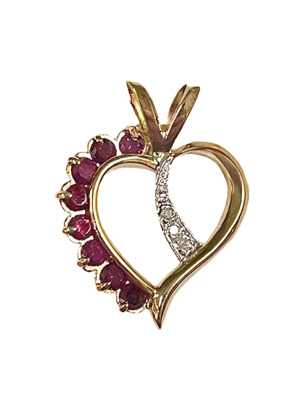 Sydänriipus rubiineilla ja timanteilla keltakulta