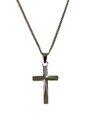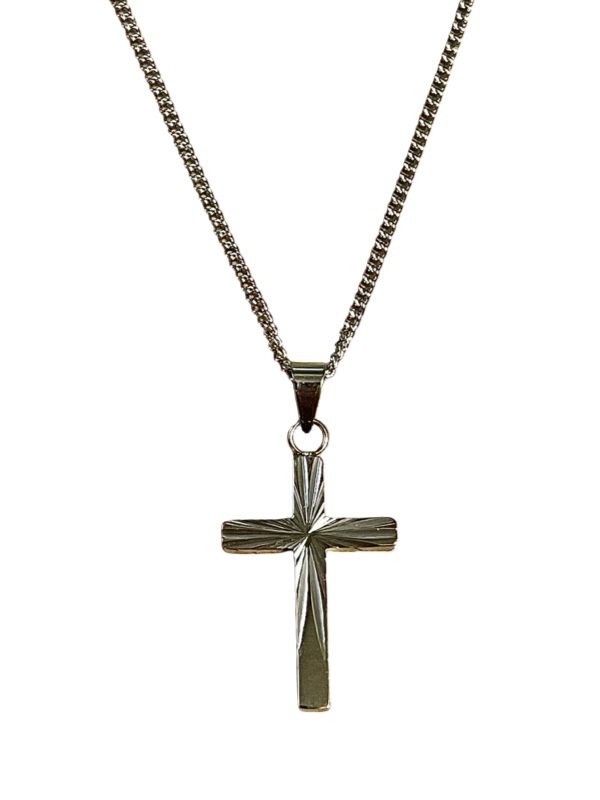 Ruostumattomasta teräksestä valmistettu timanttileikattu risti. Ketjuna 50cm pituinen panssariketju.