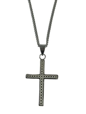 Ruostumattomasta teräksestä valmistettu kuvioitu risti. Ketjuna 50cm pituinen panssariketju.