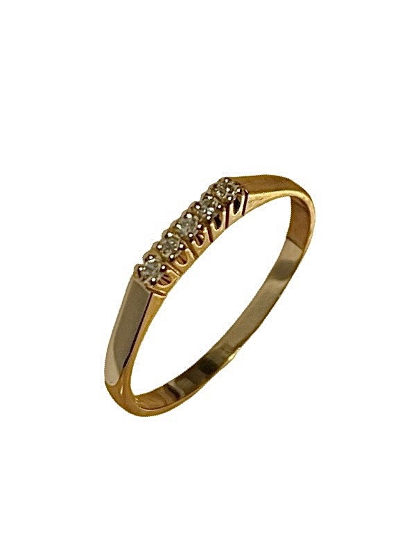 Kaunis 14k keltakultainen sormus viidellä timantilla. Koko 18,0 mm